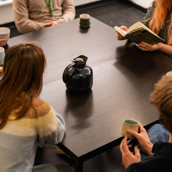 Biblioteket byder på kaffe, the og lidt sødt i pausen.